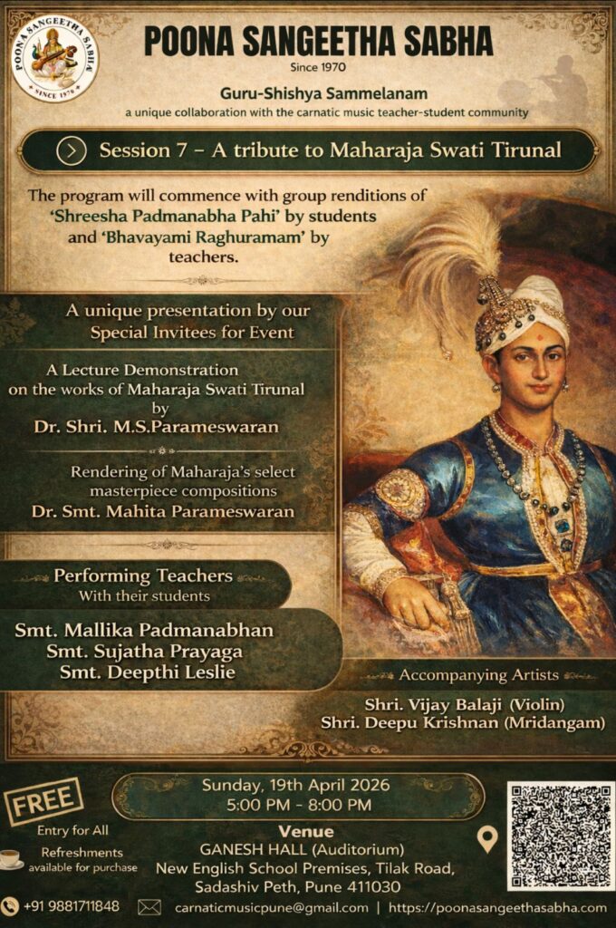 Poona Sangeetha Sabha presentsGuru-Shishya Sammelanam – Session 7 – A tribute to Maharaja Swati Tirunal Become a Member Now